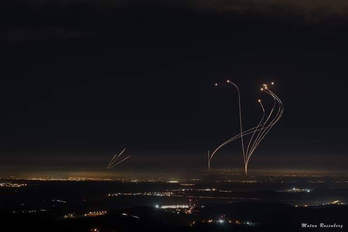Rockets shot from Gaza (left) are met with intercepting rockets from the Iron Dome (right). Blurring the line between science fiction and reality.
