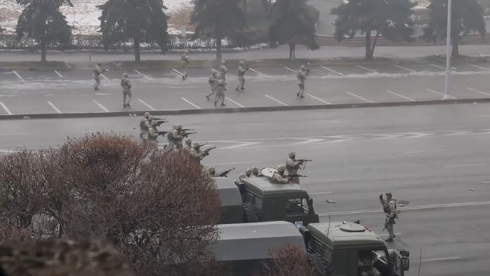 Army opened fire on protesters in Almaty, Kazakhstan. Dozens were killed and hundreds injured. Government turned off the Internet. Russia is sending their military.